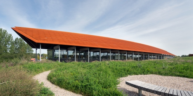 In het bovengrondse, langgerekte paviljoen zijn aan de ene kant de hoofdingang, met balie en museumwinkel , alsmede een ruimte voor tijdelijke exposities, garderobe en toiletten gesitueerd en aan de andere kant de kantoren van de medewerkers. Op de eerste verdieping bevinden zich een kleinschalig restaurant met terras (op het depot) en auditorium. De langgerekte vorm en het 70 meter lange dak van het gebouw verwijzen naar de vroegmiddeleeuwse boerderijen, zoals die in de omgeving hebben gestaan. De gebogen dakconstructie is afgewerkt met CorTenstalen beplating als een verwijzing naar rietgedekte boerderijen. De grote overstekken van het dak beschermen het interieur tegen direct invallend zonlicht, wat de toepassing van grote glasvlakken toestaat. De gevel is afgewerkt met natuursteen uit Marokko, met fossiele pijlstaartinktvissen erin, een verwijzing naar de archeologische functie van het gebouw. Deze steen komt ook weer terug in het interieur.